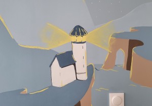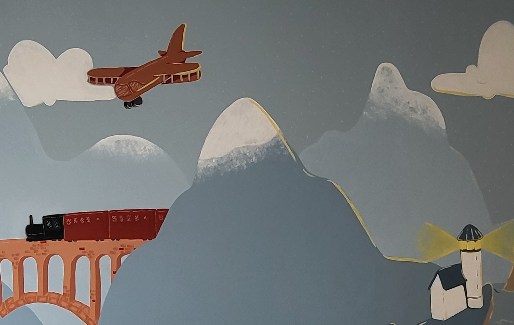 un paysage montagneux avec des éléments tels qu’un train, un avion, un phare ou encore une baleine. Je me